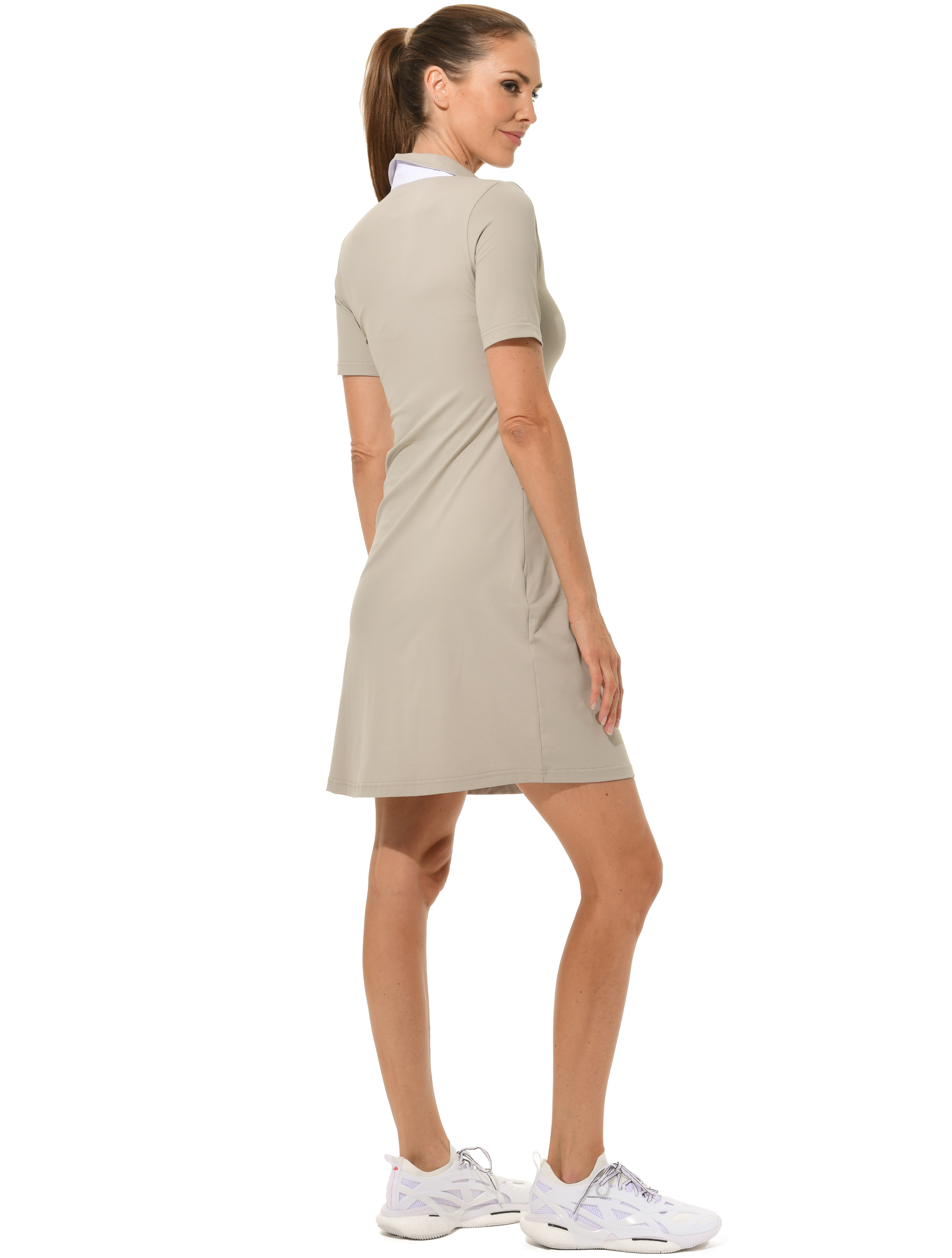 | Halbarm Jersey Polokleid mit Reißverschluss-Taschen und Jersey Panty mit Pitchgabel-Tasche 90% Polyamid 10% Elasthan Länge 92 cm (Größe 36) |