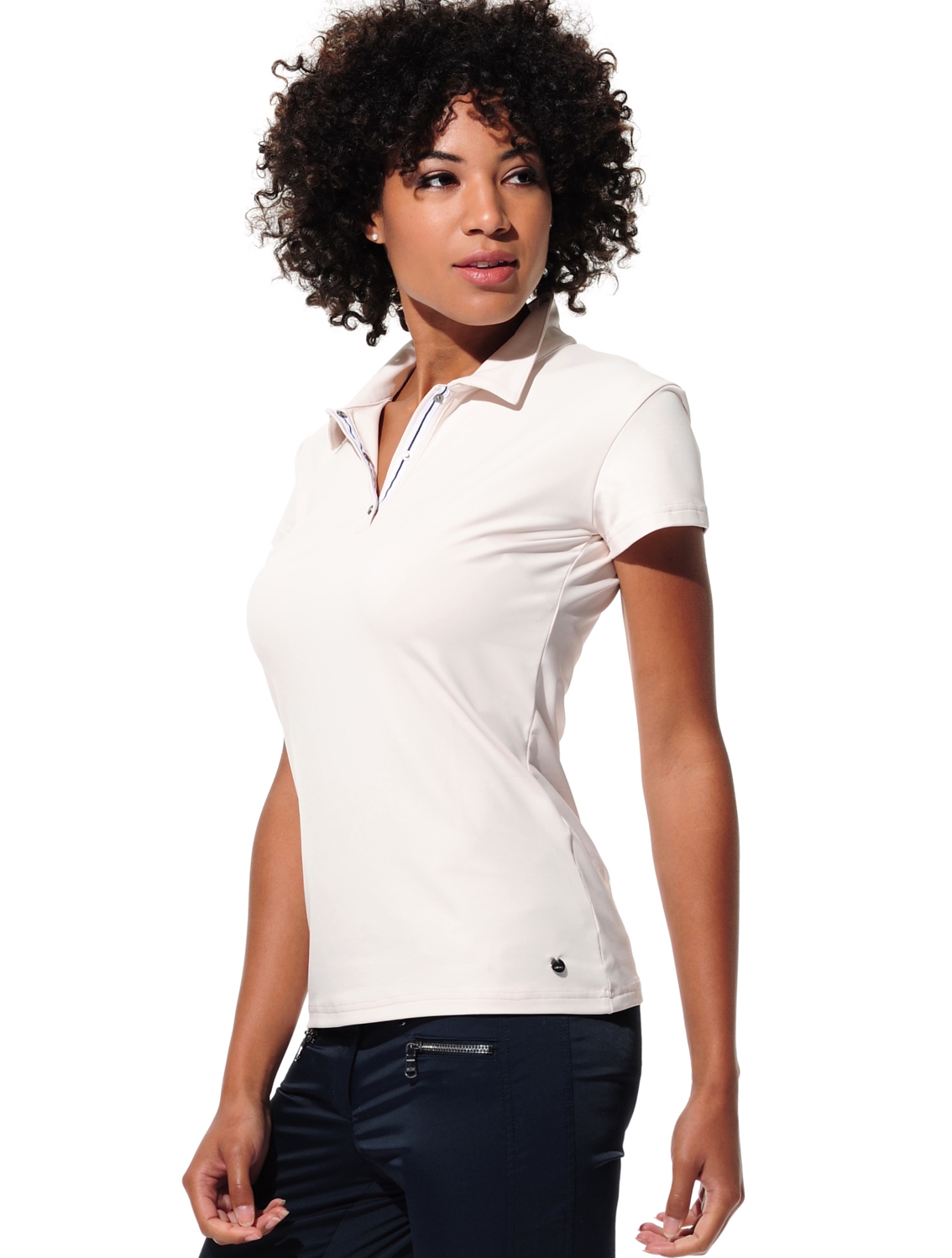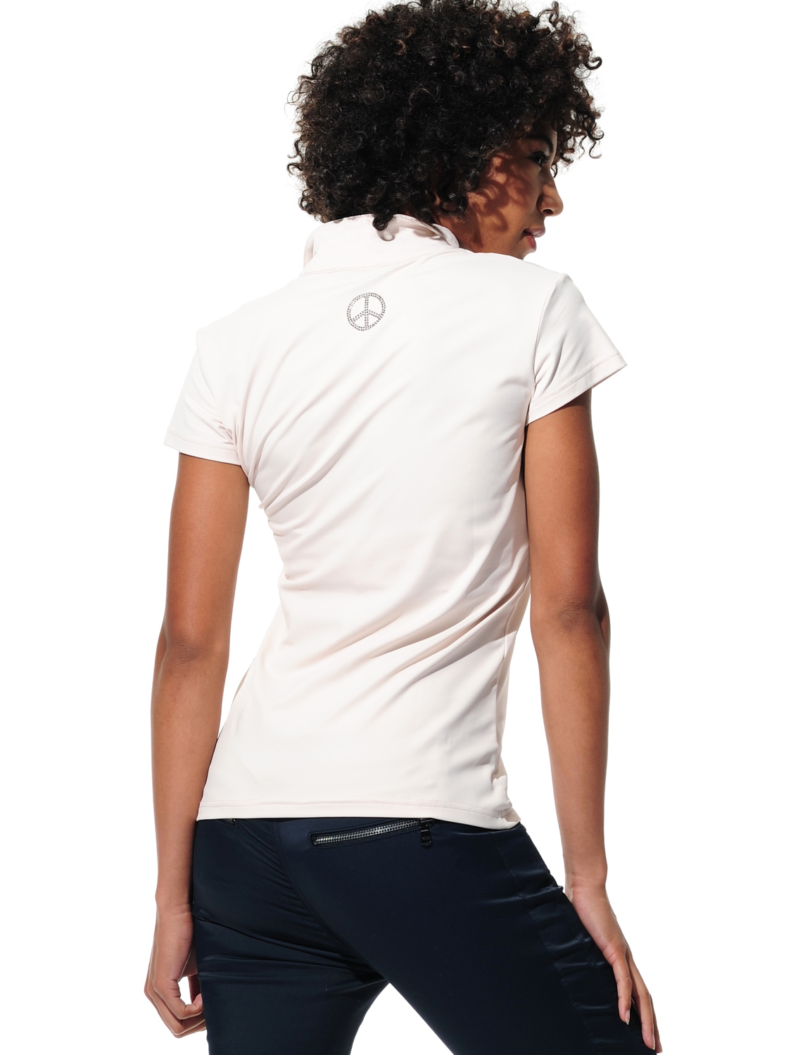 atmungsaktives Meryl Poloshirt mit Swarovski® #PEACE 90% Polyamid 10% Elasthan Länge 62 cm (Größe 36) | ![]() |