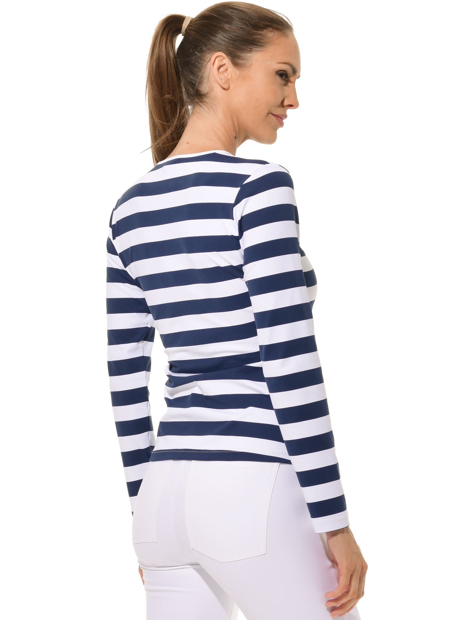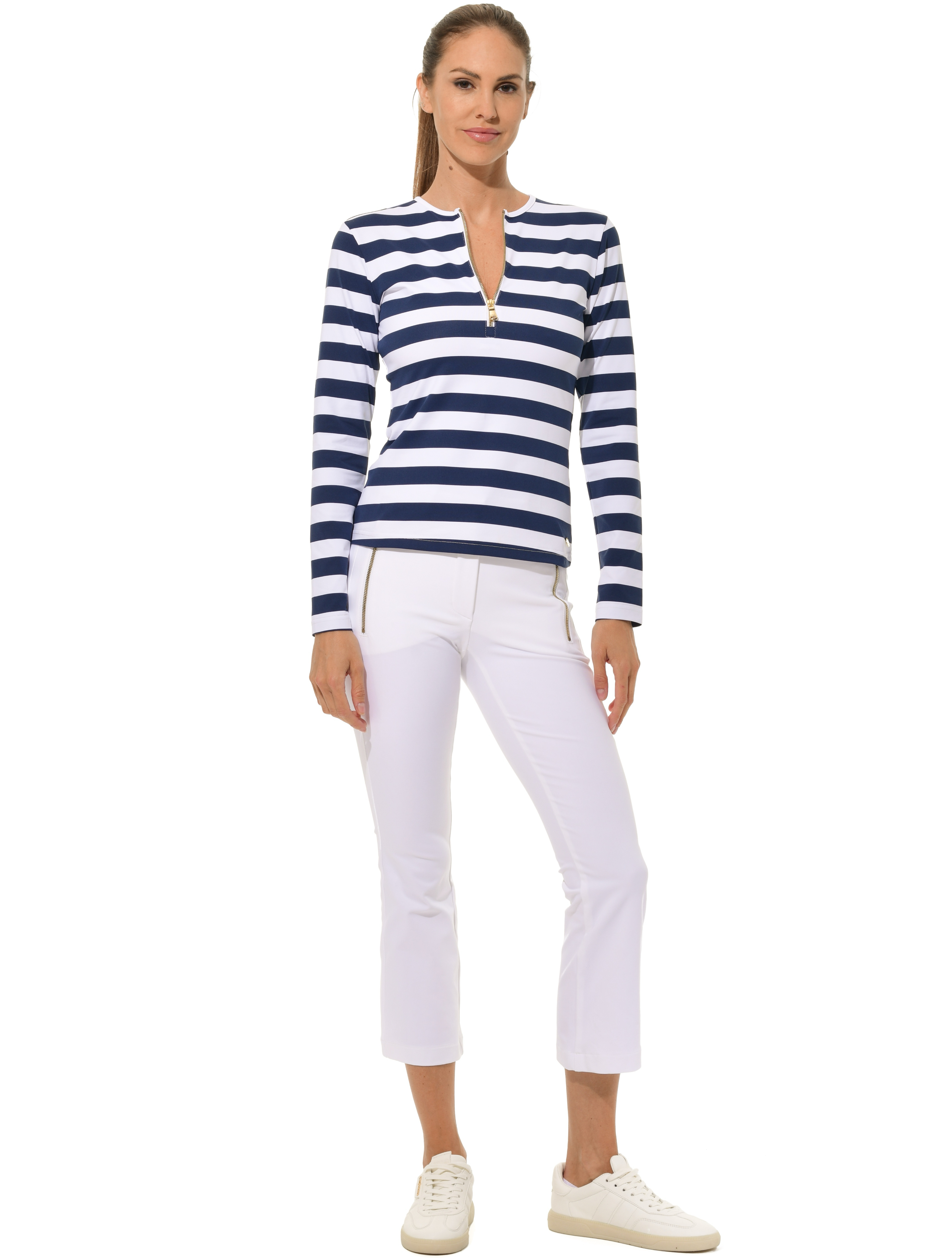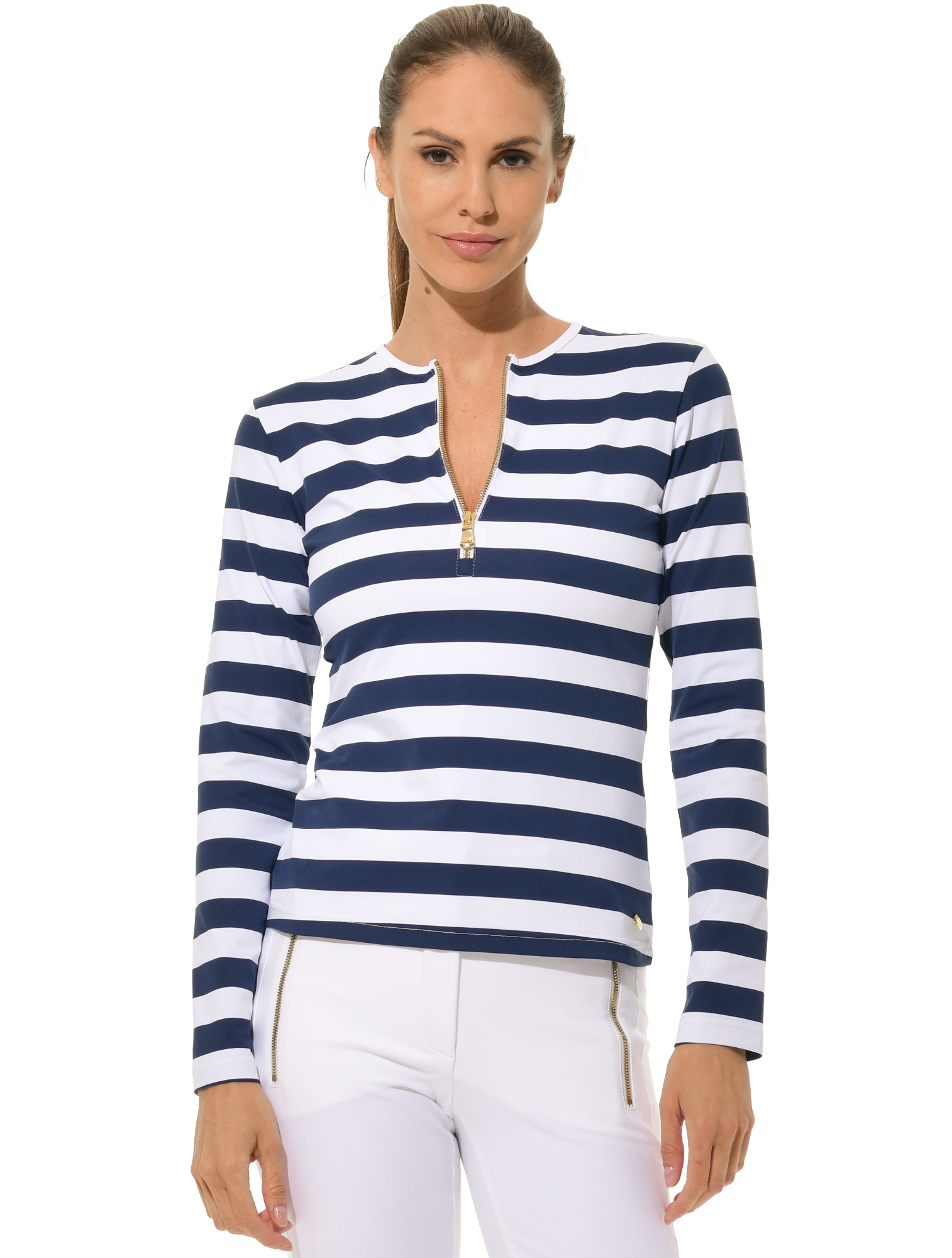 atmungsaktives Meryl Print Langarmshirt mit Shiny gold Reißverschluss 90% Polyamid 10% Elasthan Länge 60 cm (Größe 36) |