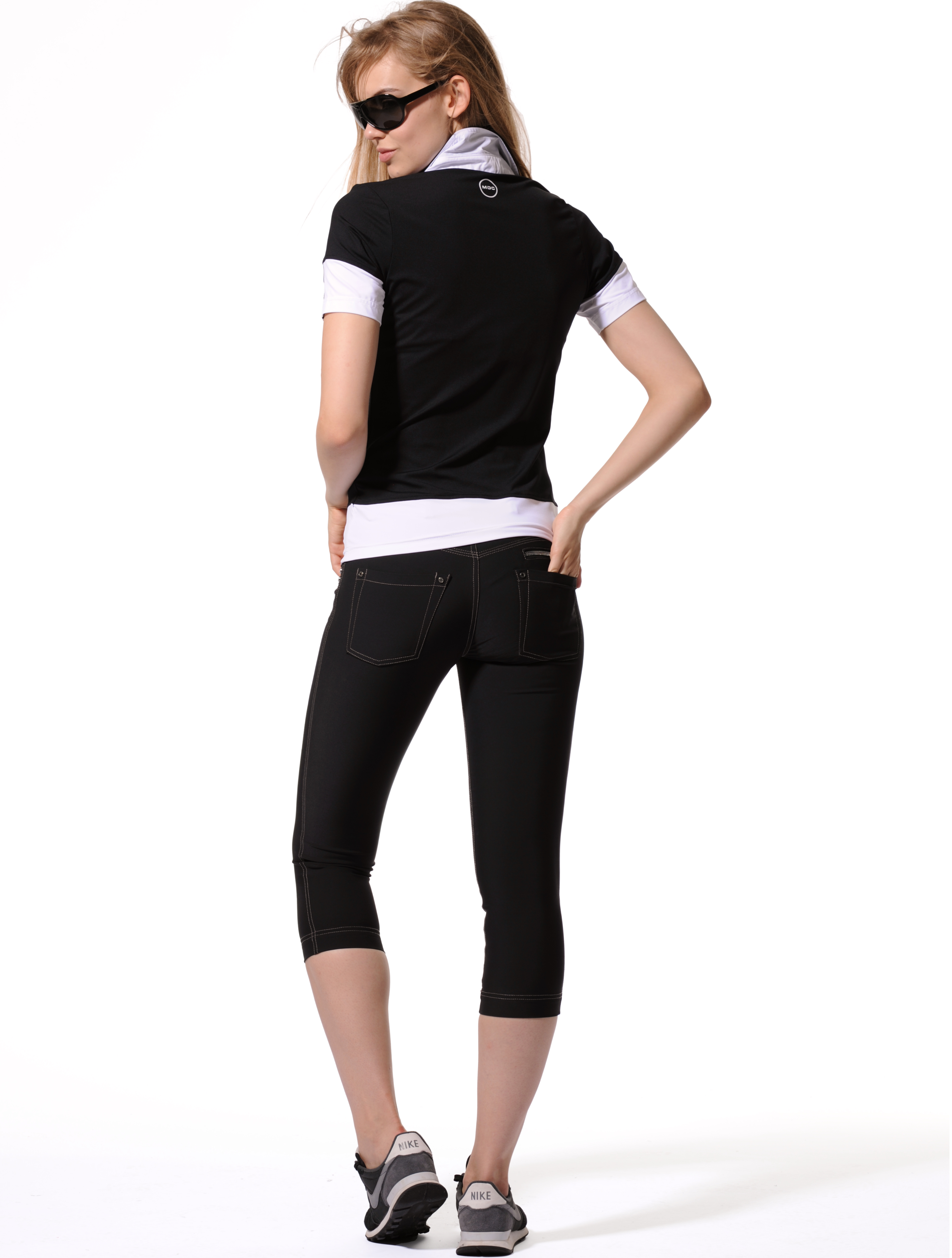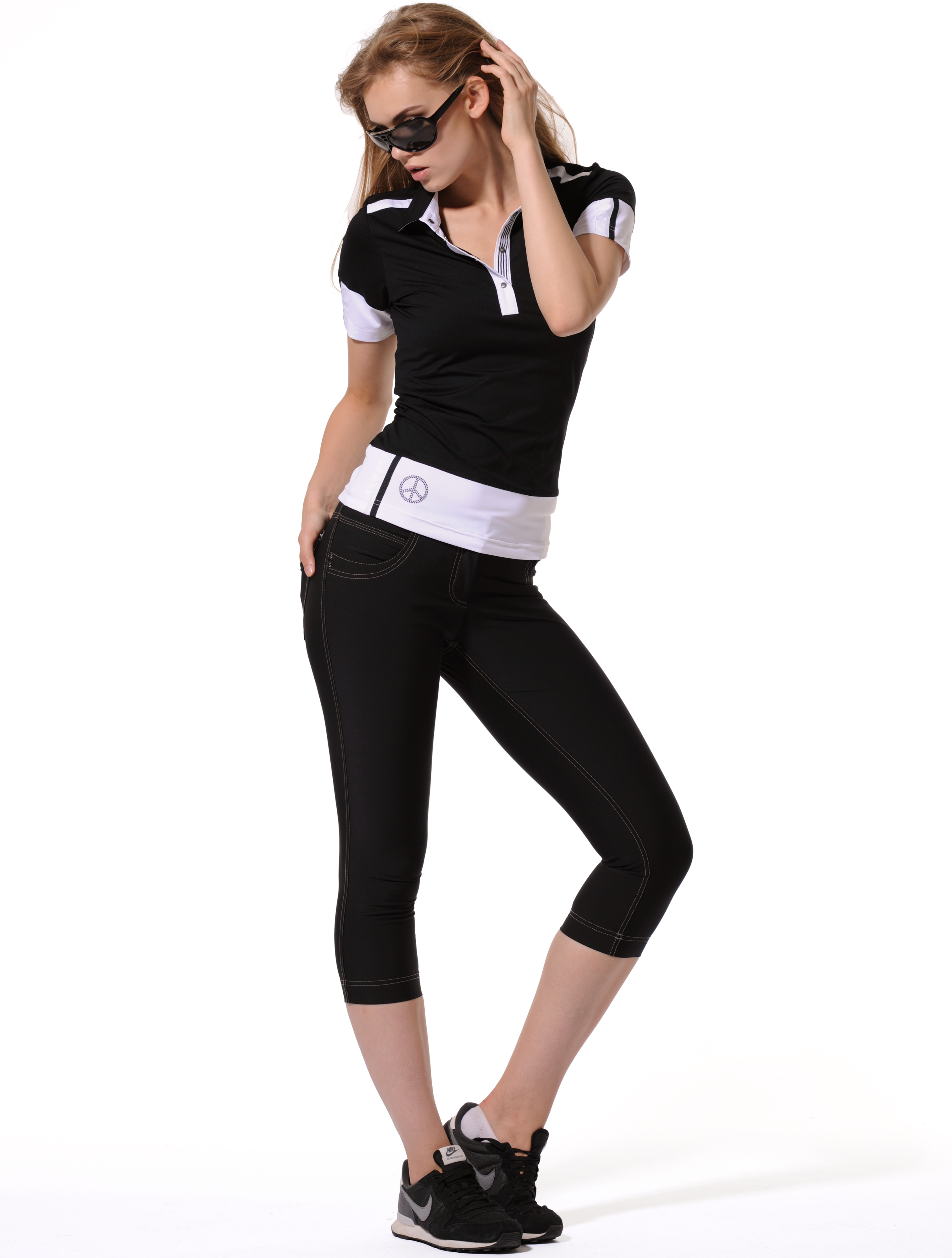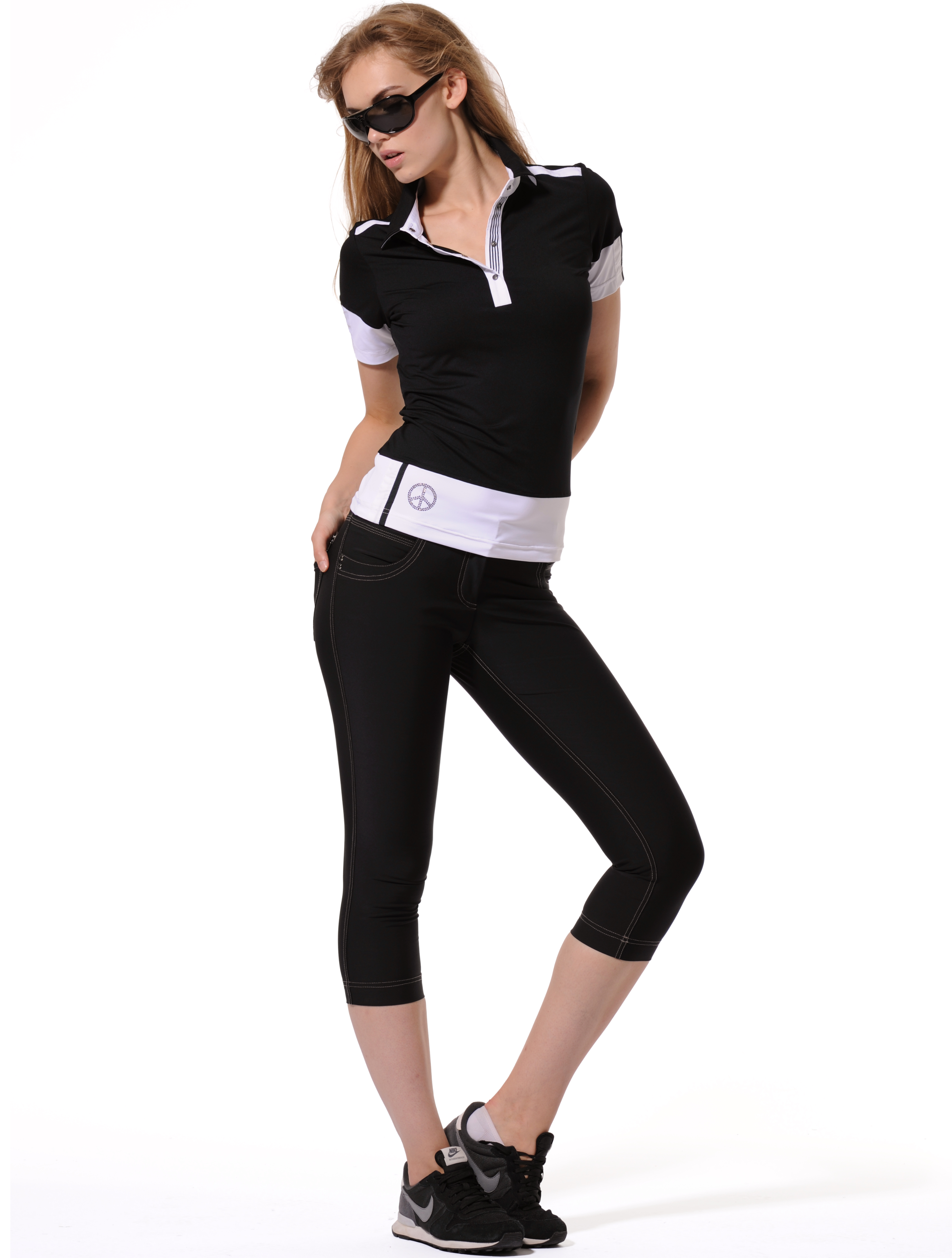breathable Meryl polo shirt with woven details, screenprint and Swarovski® #PEACE 90% polyamide 10% elasthane length 62 cm / 24" (EU size 36 / US size 4) |