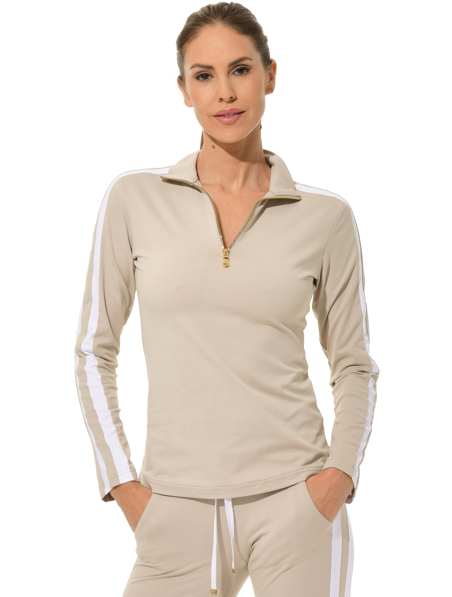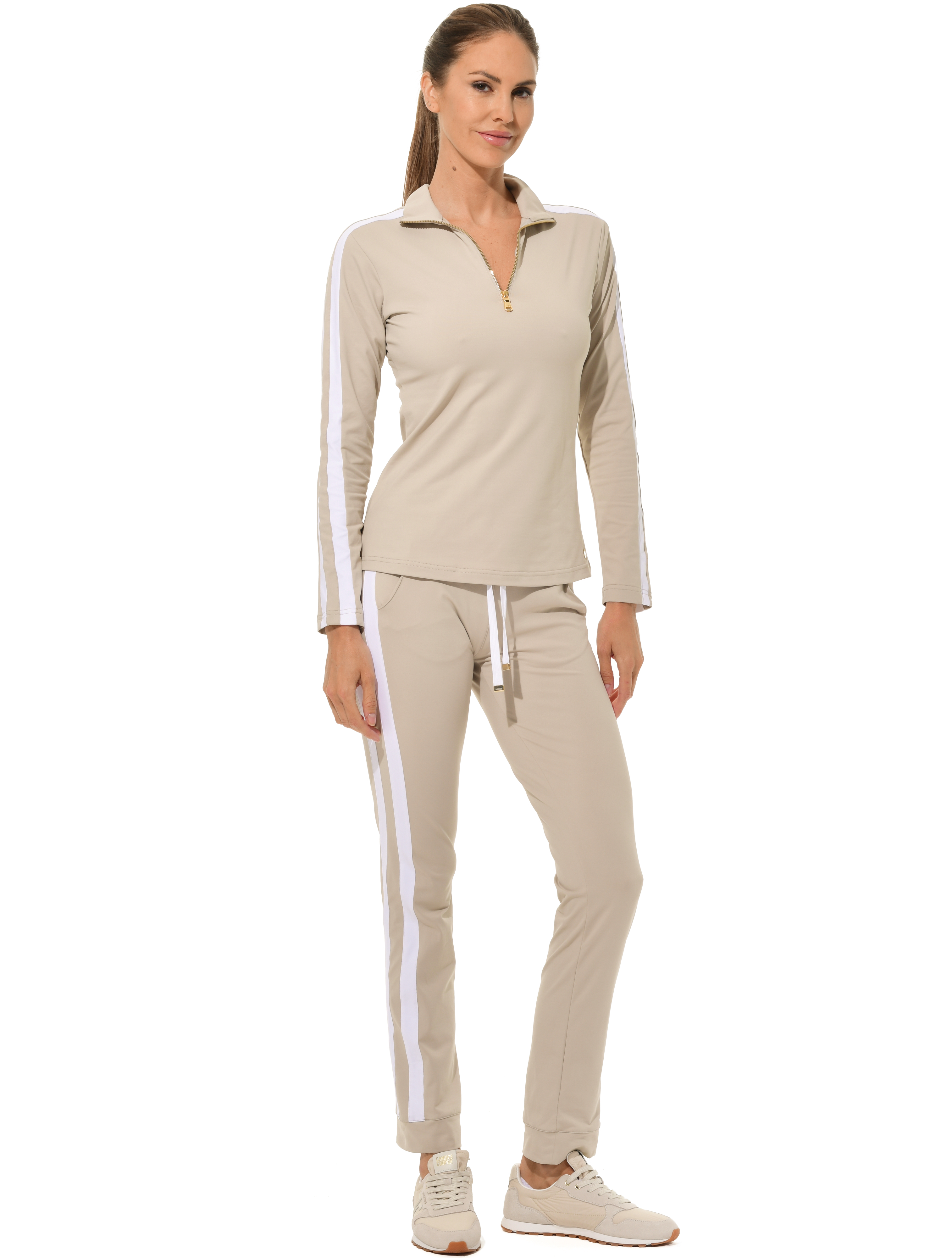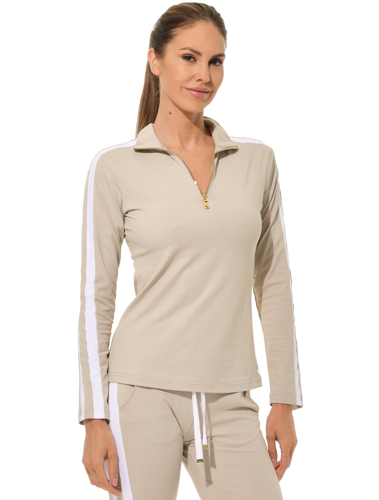 Jersey zip longsleeve light taupe/white