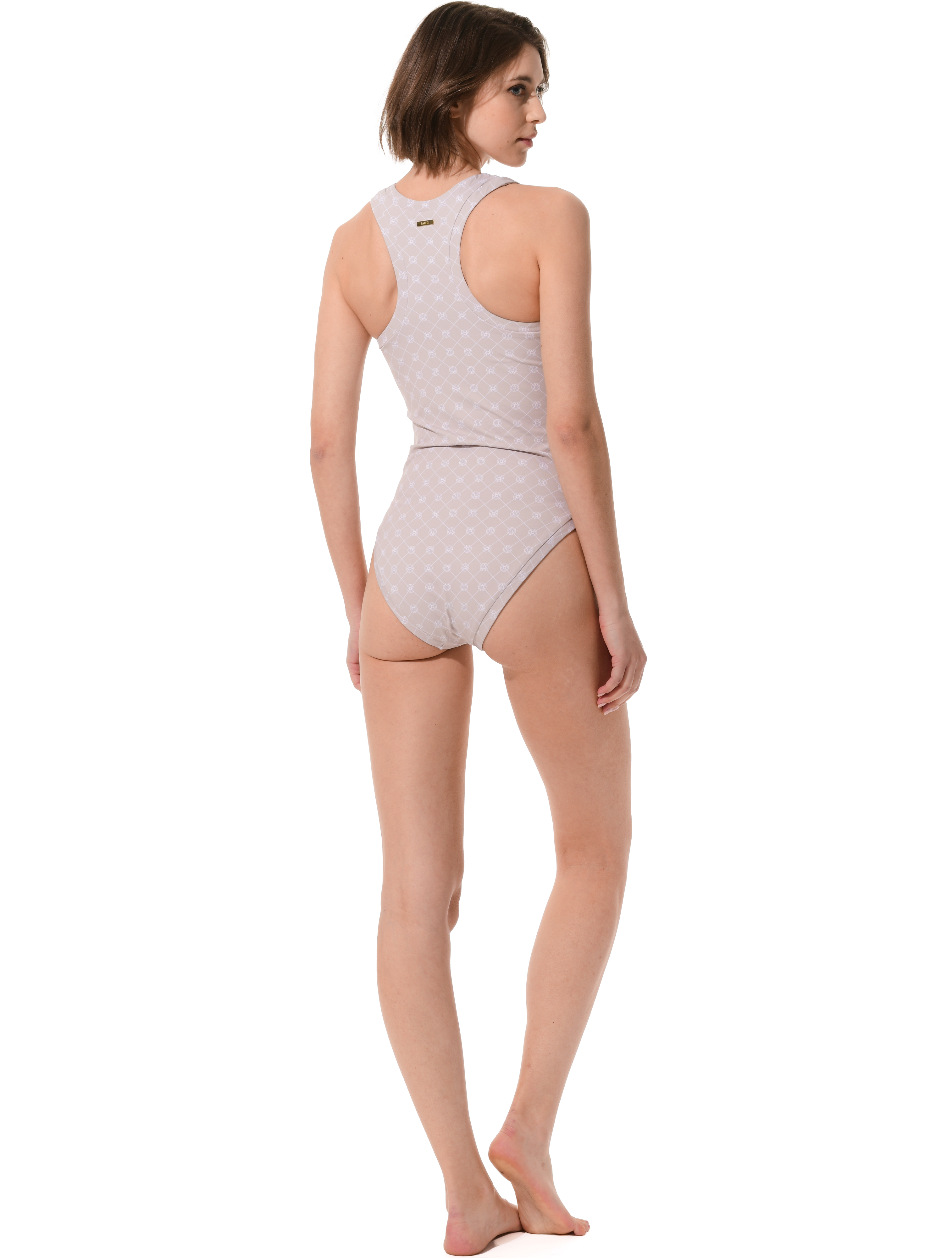 | racerback double layer print zip swimsuit with shiny gold cube zip and signature MDC logo engraved metal plaque scoop neckline, making it ideal for swimming and water sports activities internal shelf bra provides hidden support main body 90% polyamide 10% elasthane length 68 cm / 27" (EU size 36 / US size 4) |