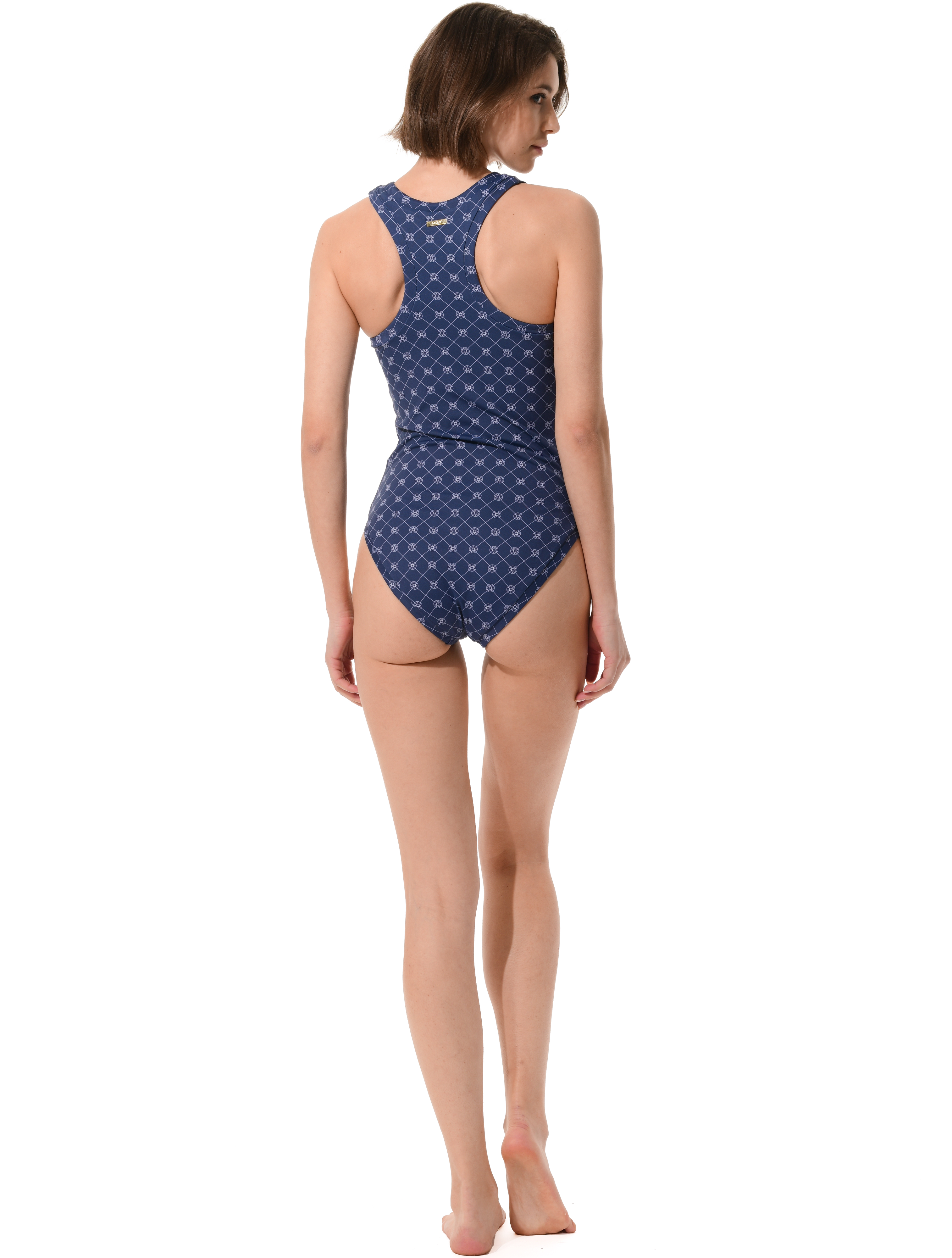 | racerback double layer print zip swimsuit with shiny gold cube zip and signature MDC logo engraved metal plaque scoop neckline, making it ideal for swimming and water sports activities internal shelf bra provides hidden support main body 90% polyamide 10% elasthane length 68 cm / 27" (EU size 36 / US size 4) |