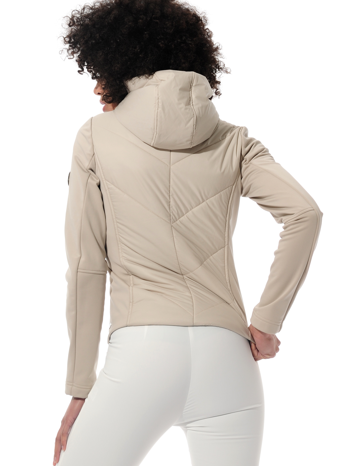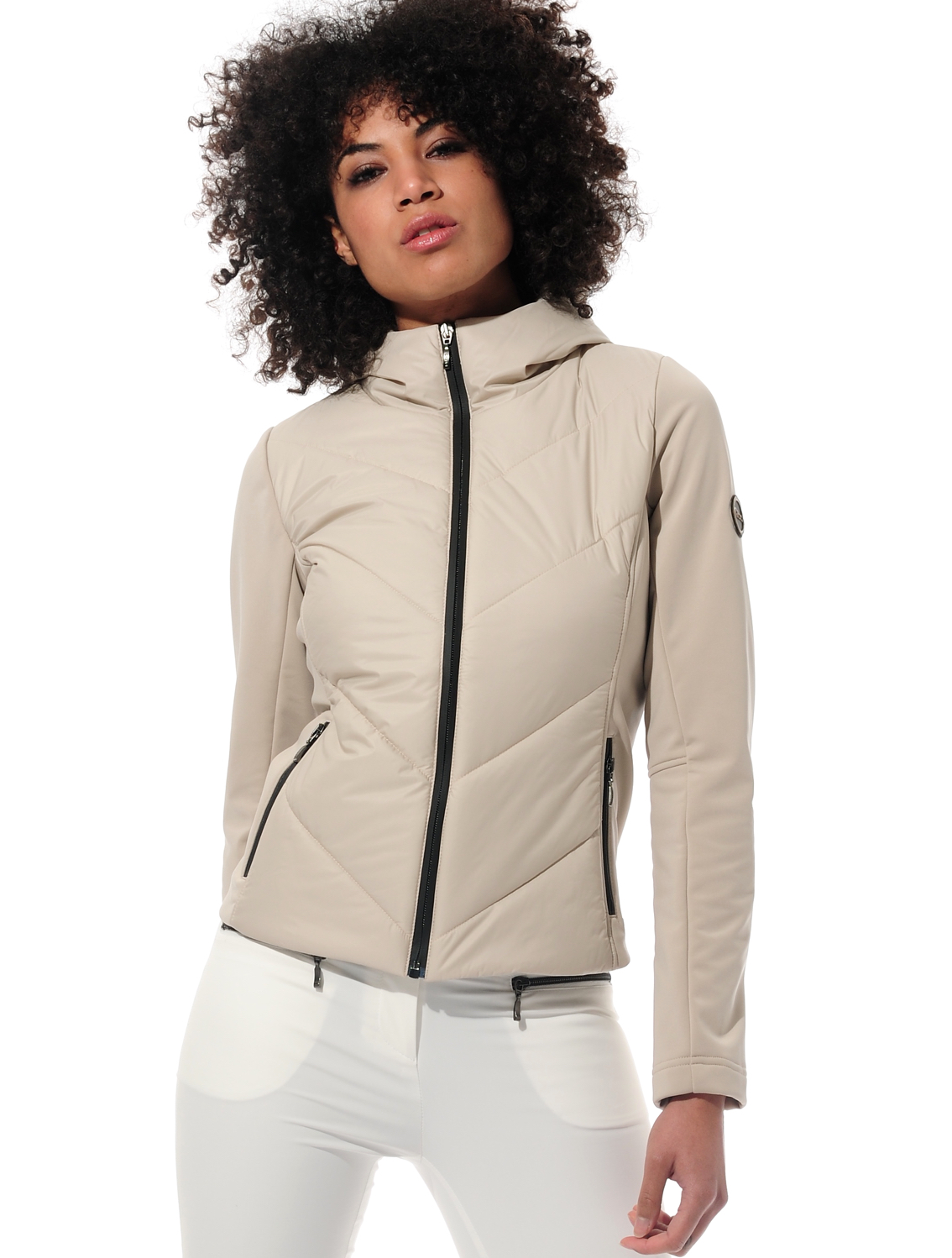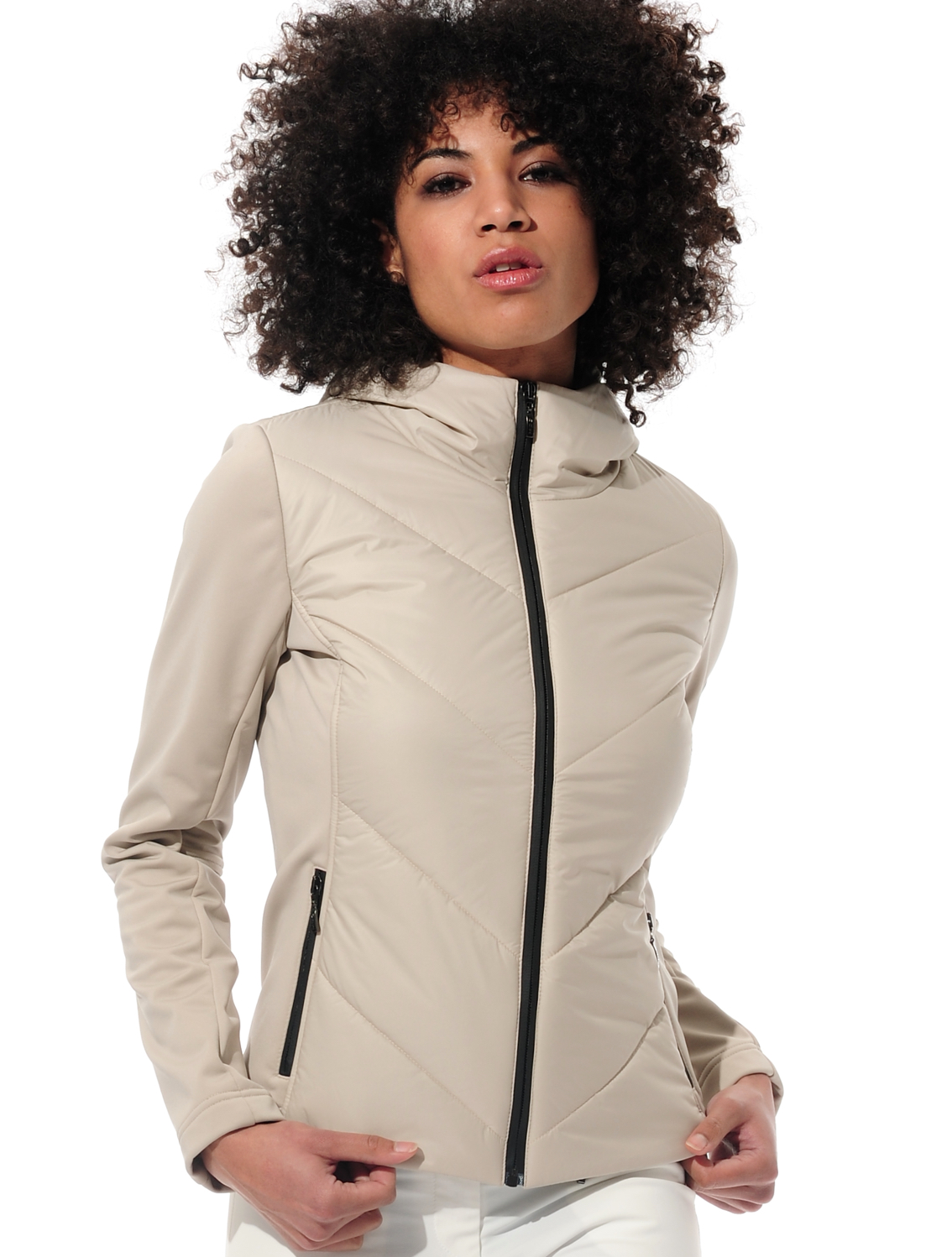 | warming, water repellent power stretch jacket with hood, quilted woven insets, breathable climate membrane, 2 inside zip pockets, and 2 zip pockets 70% polyamide 20% polyester 10% elasthane length 62 cm / 24" (EU size 36 / US size 4) |